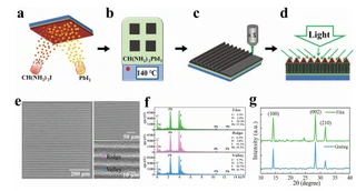 Thanks to attractive properties, such as defect tolerance, broad bandgap tunability, high quantum yields, and large absorption coefficient, perovskites have emerged as a star material in the past decade. Meanwhile, optical nano/microstructures made of perovskites offer a facile and efficient strategy to improve light-harvesting performance and sensitivity of polarization. However, there is no low-cost, high-accuracy, and reproducibility technique for large-scale fabrication of perovskite nano/microstructures. Here, femtosecond laser direct writing technique is introduced to fabricate FAPbI3 perovskite micro-grating. Based on precise spatial and power control of femtosecond laser, micro-grating with different structure parameters (period and depth) can be processed and investigated. Triangular micro-grating of perovskite exhibits excellent emission properties (up to 67 times enhancement) owing to low reflectance and high absorption intensity. Strikingly, the outstanding performance of perovskite triangle grating photodetectors is obtained. The responsivity and detectivity reach 11.7 A W−1 and 7.8 × 1012 Jones, which are ≈3 and 12 times larger than the control devices; they also exhibit lower noise and decent polarization sensitivity. Taking the advantages of low cost, high accuracy, and reproducibility, the femtosecond laser direct writing technique endows perovskite materials with micro-photonic concept and remarkably enhances the devices’ performance.