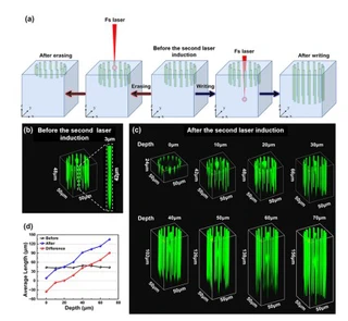 We experimentally demonstrate the highly-efficient nonlocal erasing and writing of ferroelectric domains using a femtosecond laser in lithium niobate. Based on the induction of a focused infrared femtosecond laser without any relative displacement or additional treatment, the original multiple ferroelectric domains can be either erased (erasing operation) or elongated (writing operation) simultaneously in the crystal, depending on the laser focusing depth and the laser pulse energy. In the erasing operation, the original multiple ferroelectric domains can be cleared completely by just one laser induction, while in the writing operation, the average length of the ferroelectric domains can be elongated up to 235 µm by three laser inductions. A model has been proposed in which a thermoelectric field and a space charge field are used cooperatively to successfully explain the mechanism of nonlocal erasing and writing. This methodgreatly improves the efficiency and flexibility of tailoring ferroelectric domain structures, paving the way to large-scale all-optical industrial production for nonlinear photonic crystals and nonvolatile ferroelectric domain wall memories. ©2024 Optica Publishing Group