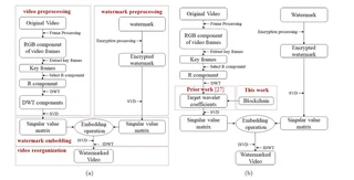 Nowadays, one of the most common approaches for video watermarking is to use singular value decomposition in the discrete wavelet transform domain. In our prior work, we formulated a video watermarking problem to achieve the maximum peak signal to noise ratio as an optimization problem. It chooses wavelet coefficient points in key frames with minimum distortion cost. Yet the existing solution has two drawbacks (1) it requires to store a large number of coordinates depending on the watermark size; (2) it is vulnerable to video frame attacks on the video frame texture area. To avoid them, this paper proposes a blockchain-based approach. Its main concept is to choose wavelet coefficient blocks in key frames and leverage blockchain to connect all the blocks. Our experimental results show that this approach is memory efficient because it only requires to store a single key for a key frame, which is independent of the watermark size; and the overall robustness is greatly improved due to the randomness of the hash function used in the blockchain. Hence, this work had made novel and significant contributions to the field of video watermarking.